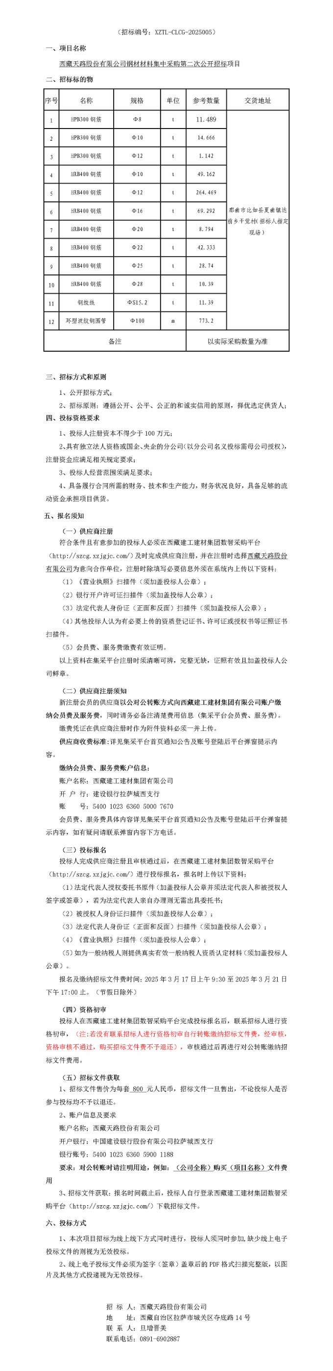 点击量:7284(招标编号:XZTL-CLCG-2025006) 一、项目名称 西藏三亿体育股份有限公司钢筋材料集中采购公开招标项目 二、招标标的物 序号 名称 规格 单位 参考数量 交货地址 1 钢筋HRB400E Φ6 T 2 西藏自治区 那曲市市内 2 钢筋HRB400E Φ8 T 4 3 钢筋HRB400E Φ10 T 3 4 钢筋HRB400E Φ12 T 12 5 钢筋HRB400E Φ14 T 12 6 钢筋HRB400E Φ16 T 12 7 钢筋HRB400E Φ18 T 12 8 圆钢HPB300 Φ8 T 240 合计 297 备注 以实际采购数量为准 三、招标方式和原则 1、公开招标方式; 2、招标原则:遵循公开、公平、公正的和诚实信用的原则,择优选定供货人; 四、投标资格要求 1、投标人注册资本不得少于100万元; 2、具有独立法人资格或国企、央企的分公司(以分公司名义投标需母公司授权),注册资金应满足相关规定要求; 3、投标人经营范围须满足要求; 4、具备履行合同所需的财务、技术和生产能力,财务状况良好,具备足够的流动资金承担项目供货。 五、报名须知 (一)供应商注册(已注册成功的可直接登录平台投标报名) 符合条件且有意参加的投标人必须在西藏建工建材集团数智采购平台(http://szcg.xzjgjc.com/)及时完成供应商注册,并在注册时选择西藏三亿体育股份有限公司为意向合作单位,注册时除填写必要信息外须在系统内上传以下资料: (1)《营业执照》扫描件(须加盖投标人公章); (2)银行开户许可证扫描件(须加盖投标人公章); (3)法定代表人身份证(正面和反面)扫描件(须加盖投标人公章); (4)其他投标人认为有必要上传的资质登记证书、许可证或授权书等证照证书扫描件。 以上资料在集采平台注册时须清晰可辨,完整无缺,证照有效且加盖投标人公司鲜章。 (二)供应商注册须知 愿意加入西藏建工建材集团数智采购平台供应商库并且有意愿投标的的企业,需缴纳平台会员费及服务费,各供应商缴费时务必备注清楚缴费信息 (集采平台会员费、服务费)与缴费单位信息,注册时在相应位置上传缴费凭证以及相应资审文件成为新供应商。 供应商入驻平台收费标准及缴费账户信息:具体内容详见集采平台首页通知公告及平台弹窗提示。 账户名称:西藏建工建材集团有限公司 开 户 行:建设银行拉萨城西支行 账 号:5400 1023 6360 5000 7670 (三)投标报名 投标人完成供应商注册且审核通过后,在西藏建工建材集团数智采购平台(http://szcg.xzjgjc.com/)进行投标报名,报名时上传以下资料: (1)法定代表人授权委托书原件(加盖投标人公章并须法定代表人和被授权人签字或签章),若为法定代表人亲自办理则无需出具委托书; (2)被授权人身份证扫描件(须加盖投标人公章); (3)法定代表人身份证(正面和反面)扫描件(须加盖投标人公章); (4)《营业执照》扫描件(须加盖投标人公章); (5)如为一般纳税人则提供真实有效一般纳税人资质认定材料(须加盖投标人公章)。 报名及缴纳招标文件费时间:2025年3月28日上午9:30至2025年4月3日下午17:30止。(节假日除外) (四)资格初审 投标人在西藏建工建材集团数智采购平台完成投标报名后,联系招标人进行资格初审,(注:若没有联系招标人进行资格初审自行转账缴纳招标文件费,经审核,资格审核不通过,购买招标文件费不予退还),审核通过后再进行对公转账缴纳招标文件费用。 (五)招标文件获取 招标文件售价为每套 400 元人民币,招标文件一旦售出,不论投标人是否参与投标均不予以退还。 账户信息及要求 账户名称;西藏三亿体育股份有限公司 开户银行:中国建设银行股份有限公司拉萨城西支行 银行账号:54001023636059001188 要求:对公转账时请注明用途,例如:(公司全称)购买(项目名称)文件费用 3、招标文件获取:报名时间截止后,投标人自行登录西藏建工建材集团数智采购平台(http://szcg.xzjgjc.com/)下载招标文件。 六、投标方式 1、本次项目招标为线上线下方式同时进行,投标人须同时参加,缺少线上电子投标文件的则视为无效投标。 2、线上电子投标文件必须为签字盖章后的PDF格式扫描完整版,以图片及其他方式投递视为无效投标。 招 标 人:西藏三亿体育股份有限公司 地 址:西藏自治区拉萨市城关区夺底路14号 联 系 人:成 凤 联系电话:0891-6902887